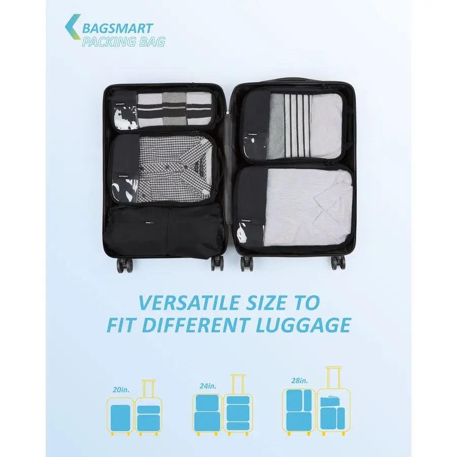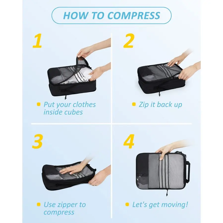 Streamline packing with lightweight, foldable compression cubes. Durable non‑woven fabric and reinforced zippers compress clothing to save suitcase space while keeping items organized and accessible. Available in 2-, 4-, or 6-piece sets and assorted colors—perfect for weekend getaways, business trips, and family vacations. Easy to pack, store, and wipe clean for repeat use.