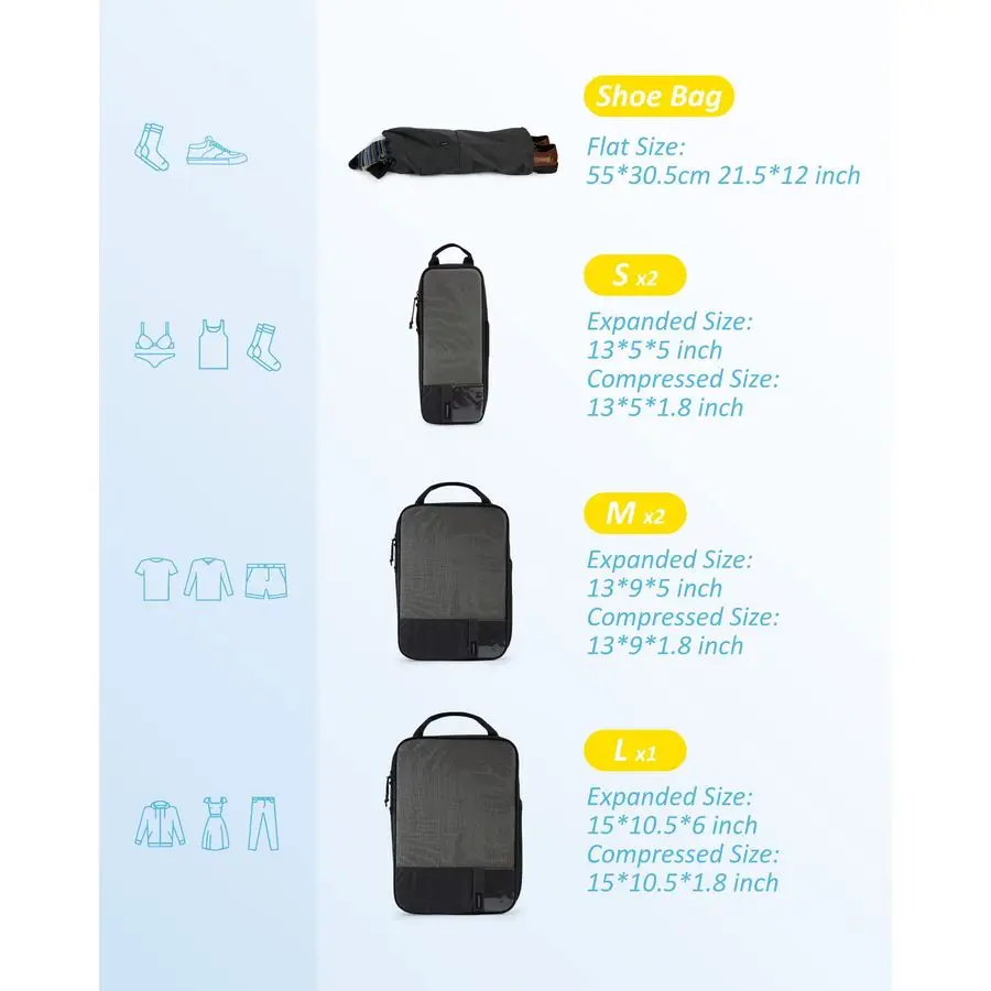 - Function: Reusable travel organizers (foldable)