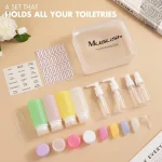 - Set includes: Multiple refillable bottles and travel jars plus a clear/zip toiletry bag (colors as shown)